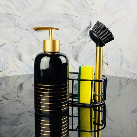Набор аксессуаров для ванной комнаты состоит из трех предметов: подставка, дозатор для жидкого мыла, щетка, губка для мытья посуды, . Набор выполнен из высококачественного фарфора с глянцевой черной эмалью и золотым декором