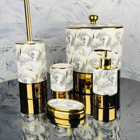 Набор аксессуаров для ванной комнаты состоит из пяти предметов: мыльница, дозатор для жидкого мыла, стакан зубных щеток, ершик для унитаза со стаканом, емкость для мелкого мусора. Набор выполнен из высококачественного фарфора с рельефными рисунками.
