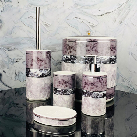 Набор аксессуаров для ванной комнаты состоит из пяти предметов: мыльница, дозатор для жидкого мыла, стакан зубных щеток, ершик для унитаза со стаканом, емкость для мелкого мусора. Набор выполнен из высококачественного фарфора с рельефными рисунками.