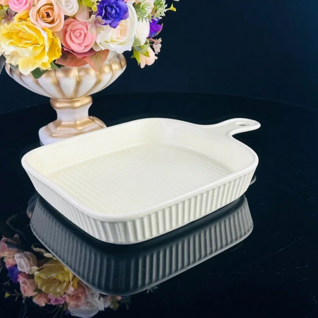 Жаропрочный фарфор - серия представлена в виде прямоугольных, квадратных, овальных и круглых блюд разного объема, круглых кастрюль и порционных формочек.