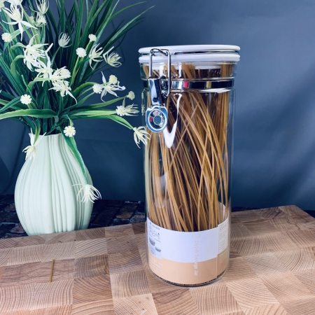 Баночка хранения спагетти, специй, сахара, кофе изготовлена из стекла, крышка из цветного пластика с бугельным замком и силиконовым уплотнителем, объем 1700 мл.