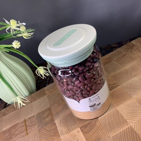 Баночка хранения специй, сахара, кофе изготовлена из стекла, крышка из цыетного пластика с силиконовым уплотнителем, объем 900 мл.