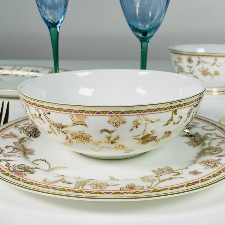 Столовый сервиз ЗОЛОТОЙ ЦВЕТОК изготовлен из костяного фарфора наивысшего качества, декорирован золотым рисунком, с добавлением контрастных красного и черных цветов. Декор красиво очерчен золотым напылением, классическая круглая форма предметов.