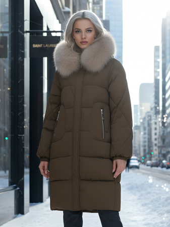 Четыре благородных оттенка коллекции осень-зима 2025 – глубокий черный, роскошный коричневый, изысканный светло-коричневый и стильный горчичный – великолепно сочетаются с натуральным мехом песца. Удлиненный силуэт до колена и свободный крой идеальны для размеров 46-54.