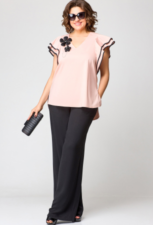 Блуза прямого силуэта с фигурным низом, выполнена из хлопка. Вырез горловины круглый на обтачке, рукава втачные двойные "крылышки". В боковых швах обработаны разрезы. Декором служит контрастная окантовка на рукавах и съемная отделочная брошь в виде двух цветов с цепочкой.