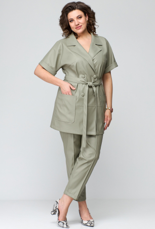 Жакет прямого силуэта, выполнен из экокожи. Полочка с нагрудными вытачками, по нижней части разрезная с накладными карманами. Застежка двубортная на четыре петли и пуговицы. Горловина V-образной формы с отложными лацканами и воротником пиджачного типа. Спинка со средним швом. Рукав длиной до локтя, цельнокроеный, по низу на притачной, отложной манжете. В области талии по боковым швам настрочены шлевки, через которые продет пояс, завязывающийся спереди.