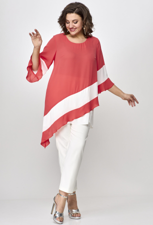 Блузка А-образного силуэта, выполнена из блузочной ткани контрастных цветов. Полочка блузки с нагрудными вытачками, горловиной круглой формы. Нижняя часть полочки и спинки с ассиметричной диагональной планкой и нижней частью из контрастной по цвету ткани. Рукав длиной ниже локтя, с планкой из контрастной ткани и воланом по низу.