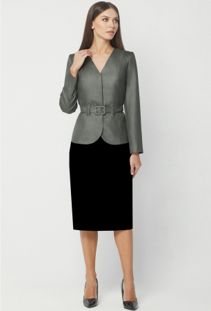 Однобортный жакет полуприлегающего силуэта с потайной застёжкой, с V-образным вырезом горловины по переду и овальной по спинке. Перед с двумя вертикальными рельефами и четырьмя отделочными рамками, через которые проходит пояс с пряжкой из основной ткани. Спинка со средним швом и двумя рельефами. Рукава втачные двухшовные. На подкладке.