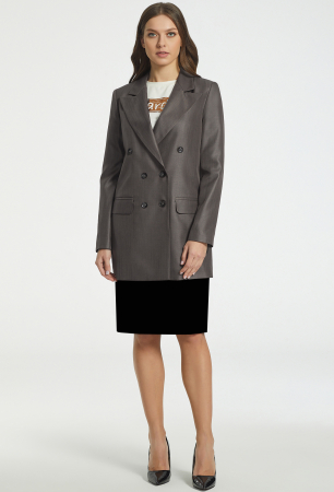 Удлинённый двубортный жакет прямого силуэта с застёжкой на петли, пуговицы и бочком. Перед с горизонтальными карманами с рамками и клапанами. Спинка со средним швом. Рукава втачные двухшовные. Воротник отложной с лацканами. Жакет на подкладке.