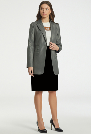 Однобортный жакет прямого силуэта с застежкой на петлю и пуговицу. Перед с двумя карманами с рамками и клапанами и одним карманом-обманкой с рамками и клапаном. Средний шов спинки заканчивается шлицей. Рукава втачные двушовные. Воротник отложной с лацканами. На подкладке.
