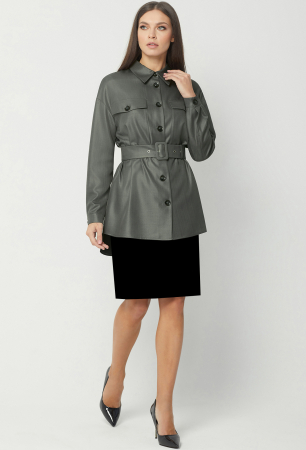 Жакет свободного кроя, со спущенной линией плеча и разным уровнем низа переда и спинки. Перед с центральной застежкой на петли и пуговицы и двумя накладными карманами с клапанами и декоративными пуговицами. Рукава рубашечного типа с манжетами и застёжкой на петли-пуговицы. Воротник отложной с отрезной стойкой. Дополняется поясом с пряжкой из основной ткани.