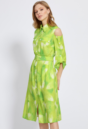 Это стильное платье-рубашка из вискозной ткани представляет собой идеальное сочетание удобства и модного дизайна. Основной цвет платья — яркий женственный принт. Элегантный А-образный силуэт и миди длина добавляют платью воздушности, а открытые плечи придают современный акцент. Платье оснащено отложным воротником со стойкой и центральной застёжкой на петли и пуговицы, создавая классический образ рубашки. Укороченные рукава с патами и пуговицами добавляют аккуратности. Практичные боковые швы с карманами и разрезами обеспечивают удобство. Линия талии подчёркивается элегантным поясом с пряжкой в тон, что делает силуэт более выразительным. Это изысканное платье подойдет как для повседневных, так и для более формальных случаев, добавляя в Ваш образ изысканности и стиля.