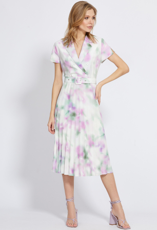 Откройте для себя это уникальное платье, идеально подходящее для особых случаев, которое сшили из приятной немнущейся ткани с эксклюзивным принтом по всей поверхности. Лиф модели с отложным воротником с лацканами, с V-образным вырезом горловины и с имитацией двубортной застёжки с пуговицами. Рукава короткие втачные, с разрезами и украшенные бусинами. Эффектность модели также придаёт плиссированная юбка, добавляя изящности при движении. Для удобства при носке, в левом боковом шве обработана застёжка на потайную молнию. Завершить образ помогает пояс с пряжкой в тон, выгодно подчёркивающий талию.