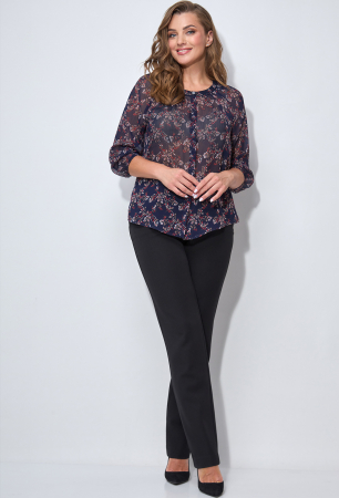 Блуза из креп-шифона с цветочным дизайном. Рукав реглан, 3/4 на резинке по низу. Застежка центральная бортовая с цельнокроеной планкой застегивающаяся на потайные петли-пуговицы, вырез горловины круглый с притачной планкой и сборкой по горловине.
