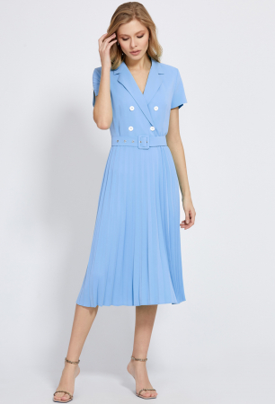 Откройте для себя это уникальное платье, идеально подходящее для особых случаев, которое сшили из приятной немнущейся ткани нежного голубого оттенка. Лиф модели с отложным воротником с лацканами, с V-образным вырезом горловины и с имитацией двубортной застёжки с пуговицами. Рукава короткие втачные, с разрезами и украшены бусинами. Эффектность модели также придаёт плиссированная юбка, добавляя изящности при движении. Для удобства при носке, в левом боковом шве обработана застёжка на потайную молнию. Завершить образ помогает пояс с пряжкой в тон, выгодно подчёркивающий талию.