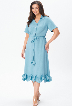Платье отрезное по линии талии. Полочка лифа платья с нагрудными вытачками и центральными притачными планками с застежкой на петли и пуговицы. Горловина V-образной формы, воротник рубашечного типа. Спинка лифа цельная. Рукав втачной,