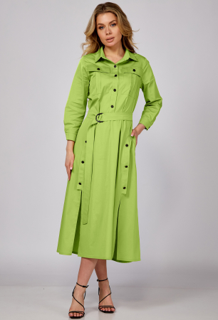 Платье полуприлегающего силуэта выполнено из ткани с хлопком, без подкладки. Платье отрезное по талии с поясом. По переду накладные карманы с клапанами. Лиф выполнен в рубашечном стиле на застежку. Рукав 3/4 на манжете. Юбка расширенная к низу с декоративными планками по переду. Карманы в боковых швах.