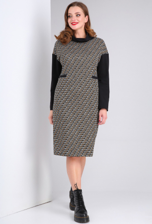 Трикотажное платье полуприлегающего силуэта с воротником-стойкой. Рукава втачные длинные, со спущенной линией плеча. По переду карманы, застёгивающиеся на декоративную пуговицу.