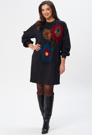 Платье (туника) свободного силуэта из трикотажной ткани с принтом. Рукав втачной одношовный со складками по низу и манжетой. Горловина обработана планкой. По переду поверх принта настрочена сетка. Сетка может быть заменена с сохранением художественного образа изделия.