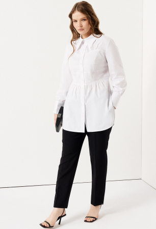 Деловая удлиненная блузка- рубашка универсального белого цвета – незаменимая вещь в базовом гардеробе. Блузка с длинным рукавом на широких манжетах, имеет рубашечный крой. Он проявляется в отложном воротнике и пуговицах по планке. Центральная часть изделия слегка приталенная, имитирующая декольтированный корсет с защипами по верхнему фигурному и нижнему краям. Блуза сшита из хлопкового трикотажа.