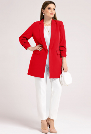 Пиджак-жакет женский выглядит необычно. Его особенность- укороченный присобранный рукав 7/8 и застежка в виде потайного крючка. Воротник пиджачного типа с лацканами создает глубокий V-образный вырез. Жакет удлинённый женский приталенного покроя стройнит фигуру, благодаря рельефам по бокам, нагрудным вытачкам. Модель дополнена прорезными карманами, прикрытыми клапанами в рамку. Пиджак пошит из эластичной, приятной на ощупь ткани с гладкой поверхностью. На подкладе. Жакет не мнется, не деформируется.