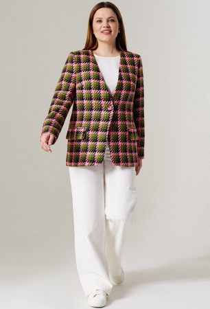 Жакет в клетку – удобная легкая одежда для прохладных вечеров. Используя его в сочетании с брюками, юбкой, топом, платьем можно создавать эффектные деловые и повседневные образы. Модный жакет в клетку имеет слегка приталенный силуэт и интересный крой. Он пошит с подкладкой, без воротника, с глубоким V-образным вырезом горловины, длинным втачным рукавом. Функцию застежки выполняет одна крупная пуговица, продевающаяся в петлю. По бокам переда имеются прорезные карманы в рамку, прикрытые прямоугольными клапанами. Вытачки обеспечивают безупречную посадку по фигуре.