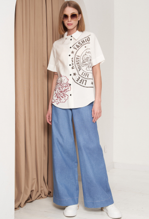 Блузка прямого силуэта с центральной застежкой на цельнокроеной планке. Воротник со стойкой. Перед с нагрудными вытачками. Спинка с кокеткой. Рукав одношовный с широкой подгибкой по низу. Низ рубашки фигурный.