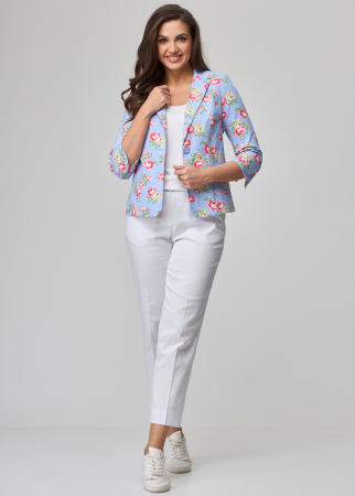 Жакет женский укороченный, полуприлегающего силуэта с центральной бортовой застежкой на пуговицы до линии перегиба лацкана. Спереди рельефные швы от плечевого шва,отрезной бочок и прорезной карман с листочкой. Спинка со средним швом и рельефами от плечевого шва. Рукав втачной, двухшовный, 3/4. Воротник пиджачного типа. Жакет на х/б подкладке. Фурнитура может отличаться от студийного фото.