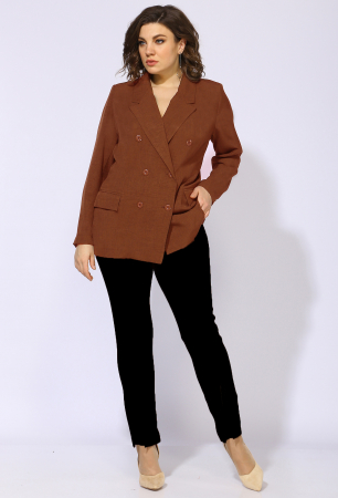 Жакет прямого силуэта, без подклада. Перед жакета с вертикальными вытачками, двубортной застежкой на петли и пуговицы и прорезными карманами с клапанами. Жакет с отрезным бочком без бокового шва. Горловина V – образной формы, с отложными лацканами и воротником пиджачного типа. Спинка со средним швом. Рукав втачной, длинный, двухшовный, со шлицей.