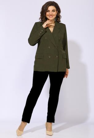 Жакет прямого силуэта, без подклада. Перед жакета с вертикальными вытачками, двубортной застежкой на петли и пуговицы и прорезными карманами с клапанами. Жакет с отрезным бочком без бокового шва. Горловина V – образной формы, с отложными лацканами и воротником пиджачного типа. Спинка со средним швом. Рукав втачной, длинный, двухшовный, со шлицей.