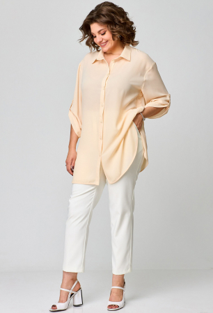 Блузка прямого силуэта, длиной ниже бедер, выполнена из однотонной ткани. Полочка с застежкой на петли и пуговицы, по правой нижней части декор в виде принта. Спинка с отрезной кокеткой, но которой выполнен декор в виде принта. Воротник рубашечного типа, стояче-отложной. Низ блузки ассиметричный, по побоковым швам обработана застежка. Пройма углубленной формы, рукав рубашечного типа, длиной 7/8 по низу с патами.