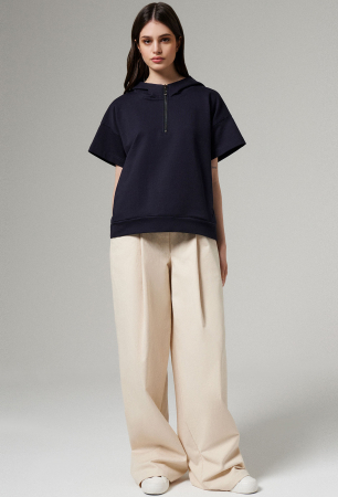 Оригинальный джемпер свободного кроя, с коротким рукавом, впереди имеется молния. Она выполняет одновременно декоративную и функциональную роль.
