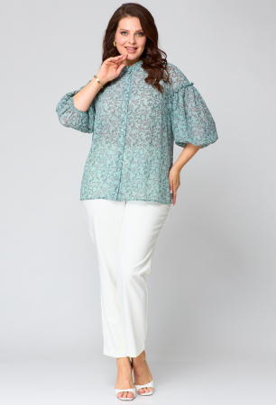 Блузка прямого, свободного силуэта, выполнена из шифона с набивным рисунком. Полочка блузки с центральной застежкой по планке на петли и пуговицы, с нагрудными вытачками. Горловина круглой формы, обработана воротником-стойкой. Спинка цельная. Рукав реглан, состоящий из верхней и нижней частей. Нижняя часть рукава со сборкой в виде рюши. По низу рукав на резинке.