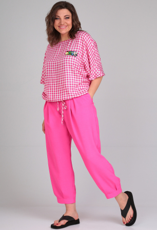 Комфортный летний брючный комплект для повседневной носки. Брюки-шаровары из легкой ткани — лен-вишер, которая хорошо держит форму, длиной 7/8, с поясом на резинке и боковыми карманами. Укороченный блузон свободного кроя из натуральной приятной на ощупь вискозы, имеет кулиску по низу изделия, которой можно регулировать плотность прилегания. Цельнокроеный рукав, округлая горловина. По переду блузона в качестве декора аппликация «love». Комплект отлично сочетается с любой по стилю обувью, он прекрасно вольется в Ваш гардероб, благодаря своей универсальности.
