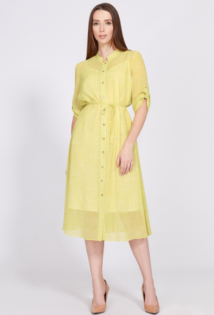 Элегантное платье-рубашка длины миди сшито из приятного шифона с эксклюзивным принтом по всей поверхности. Модель А-образного силуэта, с узким воротником-стойкой и центральной застёжкой на петли и пуговицы. Спинка с кокеткой и аккуратной сборкой. Рукава втачные укороченные с отложными манжетами, фигурными патами и отделочными пуговицами. Платье комплектуется с нижним платьем-комбинацией из комфортной 100% вискозной ткани. Для создания приталенного силуэта предусмотрен пояс-завязка, красиво подчёркивающий женскую талию.