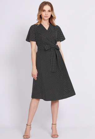 Красивое платье-миди. Модель с глубоким V-образным вырезом и запахом выполнили из легкого, приятного к телу материала. Платье с фигурными лацканами и рукавом флаттер дополнили поясом на талии.