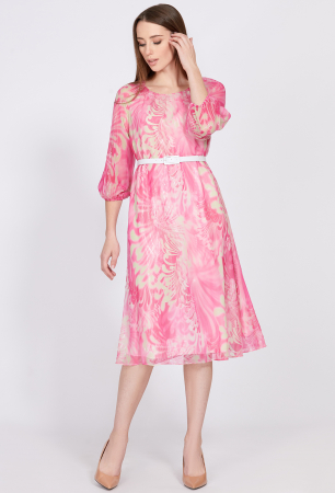 Это элегантное миди-платье – интересное предложение для женщин, которые любят чувствовать себя женственно и комфортно. Изделие выполнено из лёгкой, воздушной ткани с красивым разноцветным принтом. На подкладе. Модель А-образного силуэта с округлой формой горловины со сборкой и укороченными полупрозрачными рукавами кроя реглан со сборкой по низу, собранной на узкую эластичную тесьму. Чтобы сделать модель ещё более эффектной – линию талии подчеркнул ремнем.