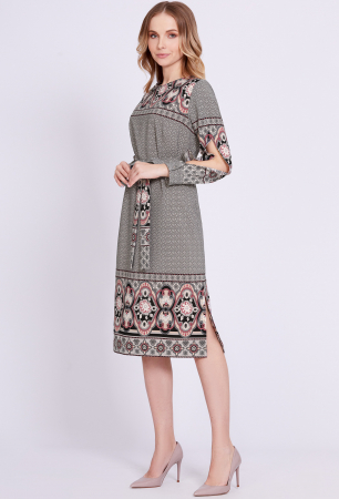 Данная модель миди-платье прямого силуэта – эталон женственного образа. Правильное настроение задали при помощи стильного принта и интересного кроя рукавов с разрезами, частично приоткрывающими руки, и манжетами с отделочными пуговицами. Динамичность модели придают разрезы в боковых швах. По спинке обработана застёжка-капля с навесной петлёй и отделочной пуговицей. Сформировать приталенный силуэт помогает ремень.