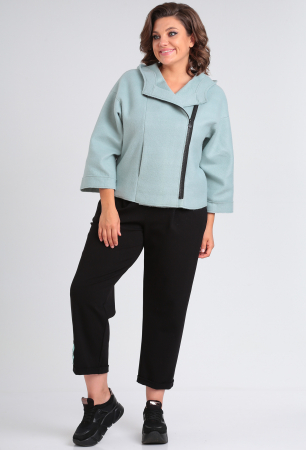 Повседневный брючный костюм из двух предметов — жакет и брюки. Жакет из буклированного однотонна, брюки — однотонный вискозный трикотаж. Жакет укороченный с капюшоном и объемными рукавами, по переду застегивается на асимметричную застежку — молнию, имеются карманы. Спинка цельная. Края жакета, рукава, борта и капюшона с открытыми срезами и отделочной строчкой. Брюки-бананы свободного кроя, длина 7/8, пояс притачной на резинке, в боковых швах карманы. Низ брюк — цельнокроеная манжета с отворотом на лицо. Брюки украшены нашивкой. Оба изделия смело можно сочетать с другими вещами вашего гардероба.