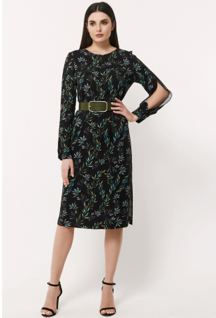 Данная модель миди-платье прямого силуэта – эталон женственного образа. Правильное настроение задали при помощи стильного принта и интересного кроя рукавов с разрезами, частично приоткрывающими руки, и манжетами с отделочными пуговицами. Динамичность модели придают разрезы в боковых швах. По спинке обработана застёжка-капля с навесной петлёй и отделочной пуговицей. Сформировать приталенный силуэт помогает ремень.