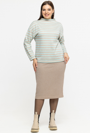 Трикотажный женский комплект состоит из свободного лонгслива и юбки миди с поясом на резинке.