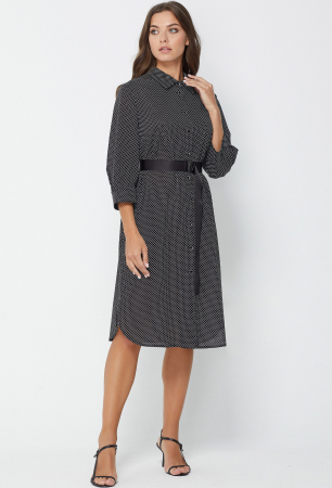 Стильное платье свободного кроя с фигурным низом, в котором угадываются черты рубашки. Перед с центральной застёжкой на петли и пуговицы. В боковых швах обработаны функциональные карманы. Несмотря на лаконичный крой модели, рукава украсили интересными элементами, такими как фигурные манжеты и встречные складки, придающие платью романтический вид. А контрастный пояс с D-пряжками помогает красиво подчеркнуть талию.