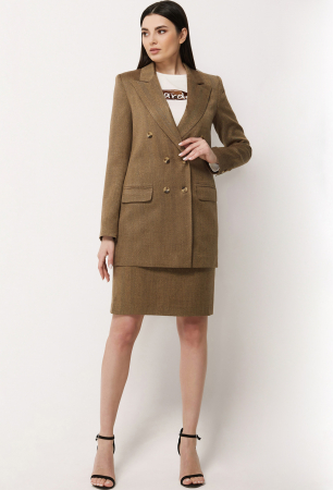 Удлинённый двубортный жакет прямого силуэта с застёжкой на петли, пуговицы бочком. Перед с горизонтальными карманами с рамками и клапанами. Спинка со средним швом. Рукава втачные двухшовные со шлицами и декоративными пуговицами. Воротник отложной с лацканами. Жакет на подкладке с плечевыми накладками.