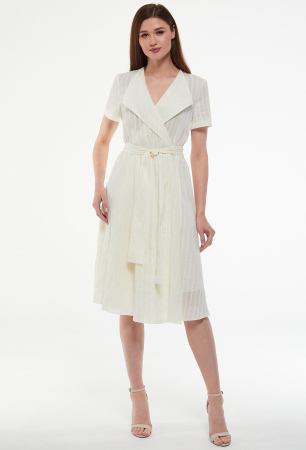 Красивое платье-миди. Модель с глубоким V-образным вырезом и запахом выполнили из легкого, приятного к телу материала. Платье с фигурными лацканами и рукавом флаттер дополнили поясом на талии.