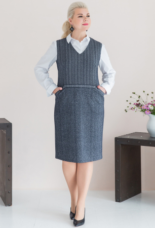 Платье полуприлегающего силуэта без рукава с V-образным вырезом горловины. По переду карманы в шве с листочкой. По спинке застежка на потайную молнию по среднему шву спинки и шлица по низу.