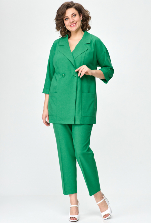Жакет прямого силуэта. Полочка жакета с двубортной застежкой на петли и пуговицы, вертикальным рельефом и накладным карманом по нижней части бочка. Горловина V-образной формы, с отложными лацканами и воротником пиджачного типа. Спинка жакета со средним швом. Пройма углубленной формы имеет удлиненную линию плеча. Рукав рубашечного типа, одношовный, длиной 3\4, по низу рукав с цельнокроеной отложной манжетой. Брюки укороченные по длине, полуприлегающие по бедрам, свободные в колене и слегка зауженные к низу. По передним половинкам выполнены наклонные карманы. Брюки на притачном поясе с эластичной тесьмой. Брюки со стрелками.