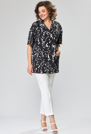 Костюм состоит из жакета и брюк. Жакет выполнен из ткани с набивным рисунком. Брюки из однотонной ткани.