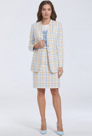 Стильный однобортный жакет полуприлегающего силуэта выполнен из мягкой приятной испанской ткани с добавлением вискозы с интересным сочетанием клетки. Перед с небольшой цельнокроеной стойкой, с глубоким фигурным вырезом, с застёжкой на две петли-пуговицы, с скругленными бортами, с горизонтальными карманами с листочками и отделочными пуговицами. Спинка с отрезной стойкой. Рукава втачные двухшовные со шлицами и отделочными пуговицами. На подкладке.