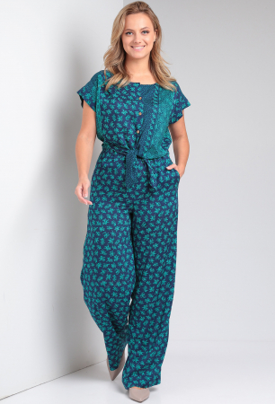 Комплект женский состоит из блузки и брюк свободного покроя, выполнен из штапельной ткани с принтом. По переду блузки центральная застежка на петли и пуговицы. Линия плеча спущена, по низу рукава манжета. По спинке средний шов и складка в области горловины. Низ спинки присобран на резинку. Брюки прямые свободные с поясом на резинке. В боковых швах функциональные карманы.