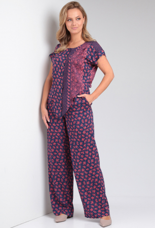 Комплект женский состоит из блузки и брюк свободного покроя, выполнен из штапельной ткани с принтом. По переду блузки центральная застежка на петли и пуговицы. Линия плеча спущена, по низу рукава манжета. По спинке средний шов и складка в области горловины. Низ спинки присобран на резинку. Брюки прямые свободные с поясом на резинке. В боковых швах функциональные карманы.
